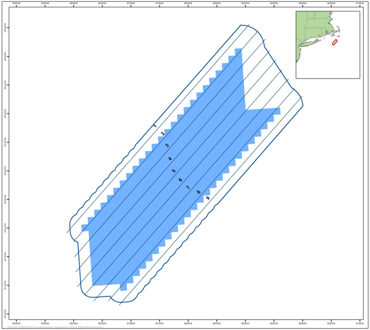 ![]() MA OCS-A 0520 Lease Area and the irregular 1 nm / c. 4 km NE km buffer showing the aerial survey flight lines.